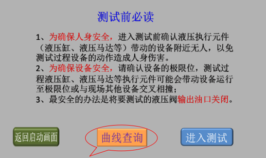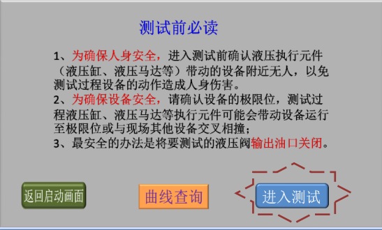 3、確認現(xiàn)場人員和設(shè)備安全后,點擊“進入測試”,進入液壓閥測試類型選擇畫面;
