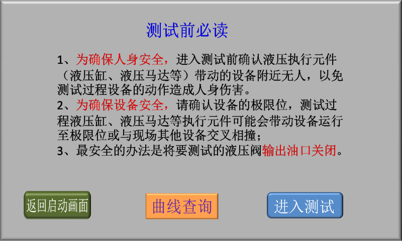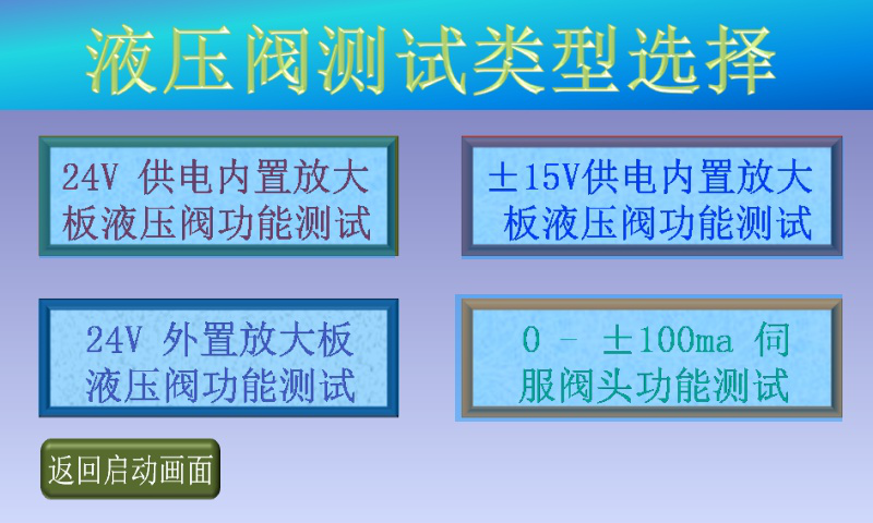 3、確認現(xiàn)場人員和設備安全后,點擊“進入測試”,進入液壓閥測試類型選擇畫面;
