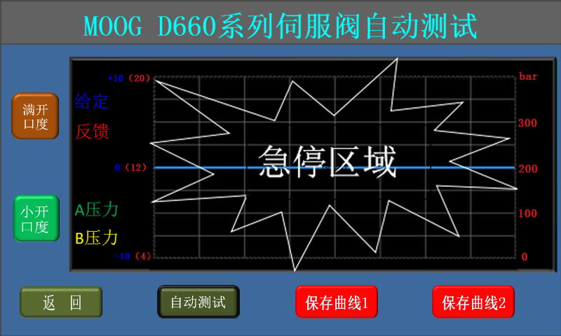 自動測試過程中出現(xiàn)緊急情況,可點擊屏幕中間黑色的曲線部分,儀器將給伺服閥斷電,重新選擇開口度后儀器會再次給伺服閥上電;